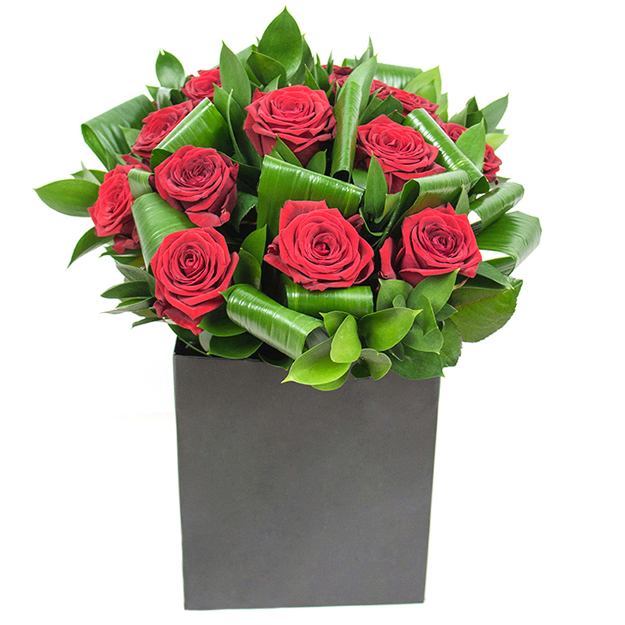Enhance your living space with our stunning red rose display, featuring vibrant red roses, rich aspidistra leaves, and delicate ruscus. This unique arrangement offers unmatched beauty and style, perfect for any occasion.